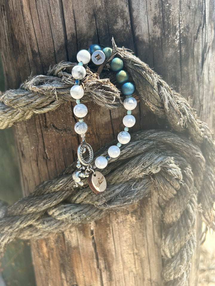 A boho chic bracelet accented with rich, blue druzy stones, marbeled beads and our official Gulf Shores logo.