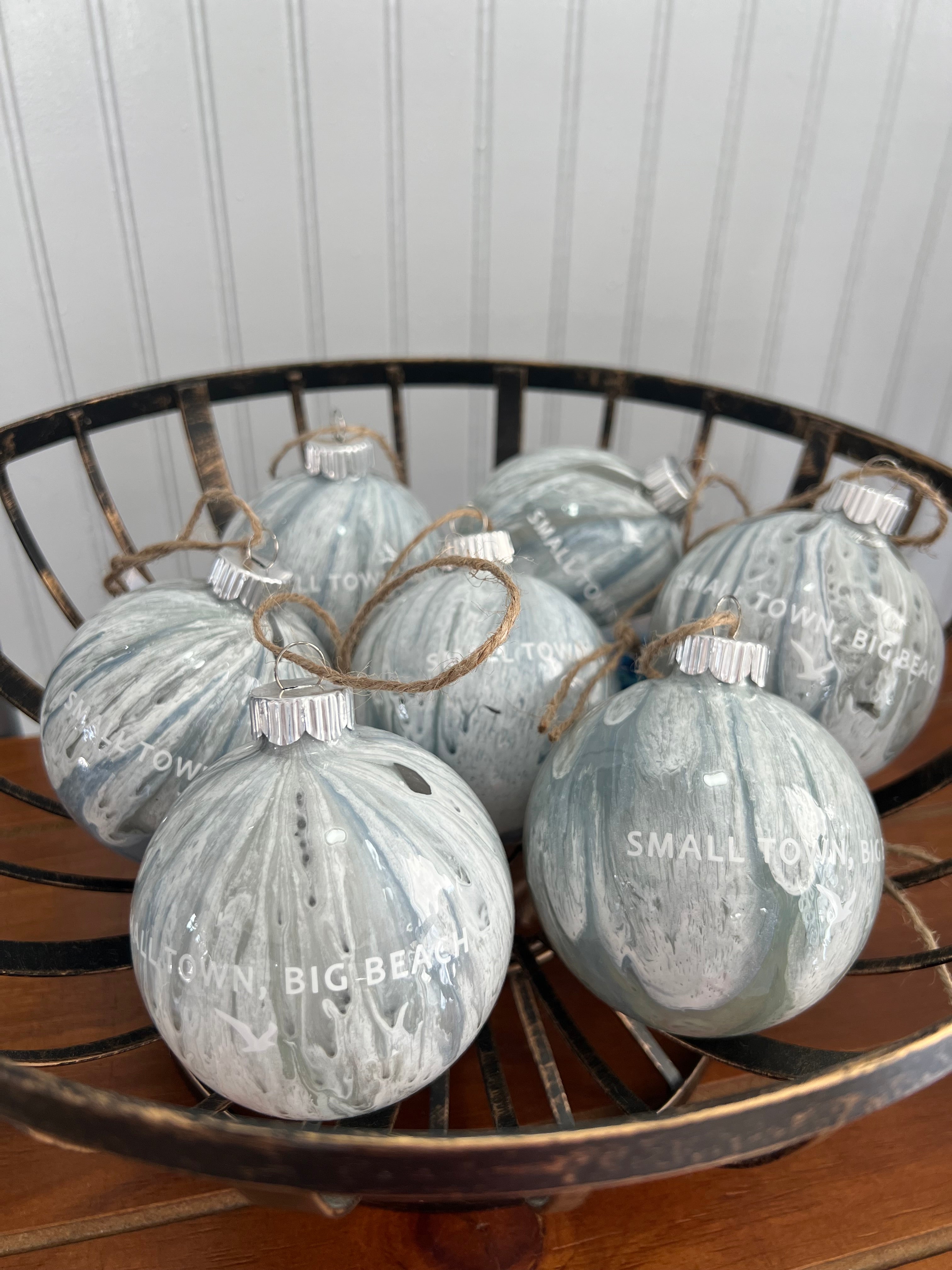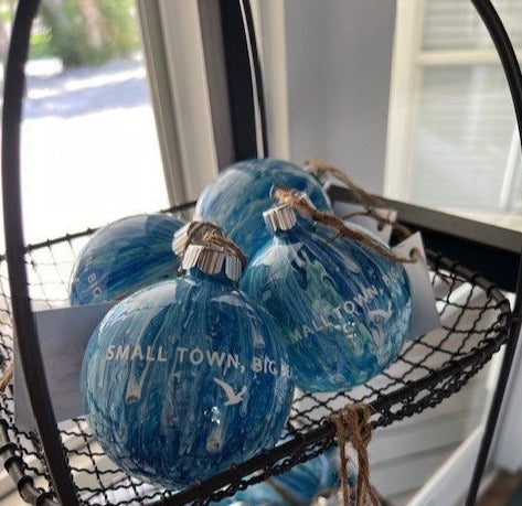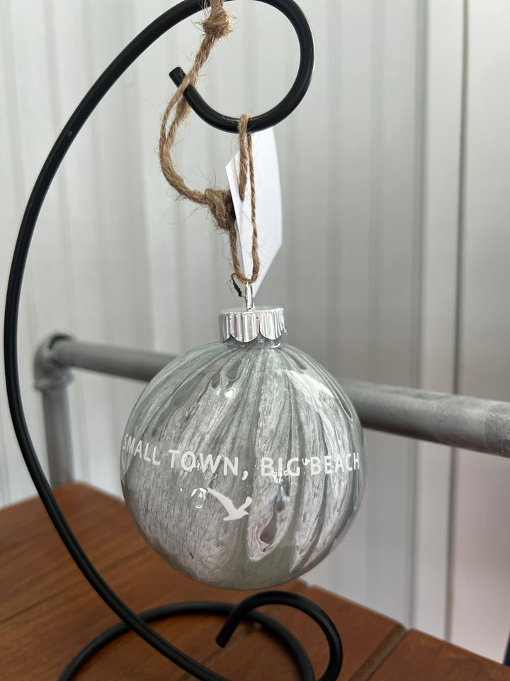 Glass ornament with resin detail and our "SMALL TOWN, BIG BEACH" tagline.