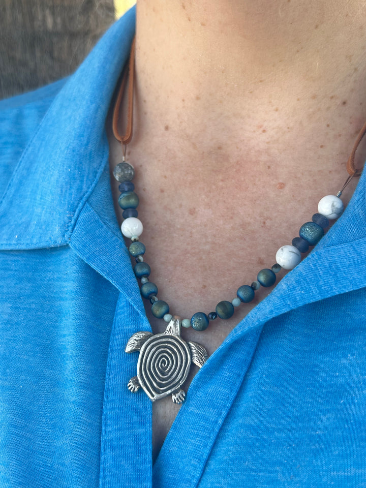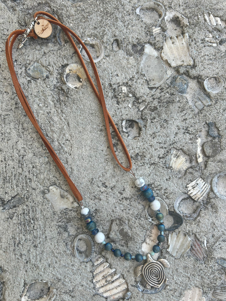 This boho chic necklace includes a reversible turtle pendant with blue druzy stones, glass beads on leather and our Gulf Shores logo.