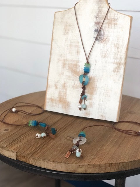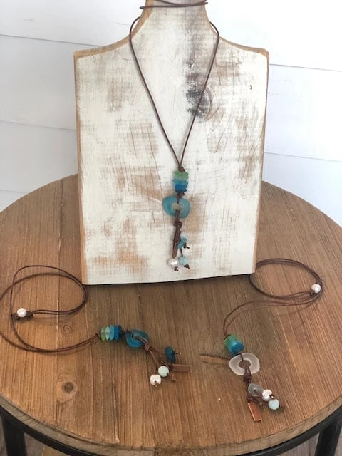 Handmade locally by Blue Girl Beading CO. , the Gulf Shores Sea Glass Necklace is sure to impress! Each piece has all the earthy beach vibes with its accents of sea glass, leather, freshwater pearls, copper and an Amazonite bead.